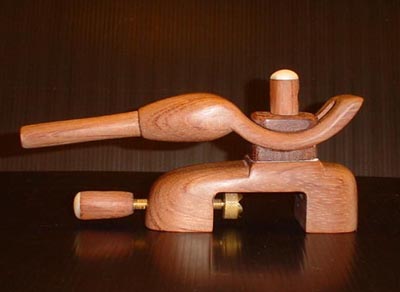 製作過程三、接下來準備鑽孔了。在基台上有四個洞要鑽,前面固定夾的大孔:通常是用10mm的鑽頭來鑽,這得依據您的金屬零件實際測量來決定。支撐弓及上面旋鈕的那個螺絲孔:5mm的。基台後段有兩個三角錐:4mm的。基台上這四個孔只有這兩個三角錐比較難施工,因為基台的內弓距離太短,電鑽是不可能申進去鑽的!一般的4mm鑽頭都很短,不會超過10公分長,想從前面那個大孔伸進來鑽又不夠長?所以這裡得加工想辦法了,我是用一支鐵棒,請金屬加工的朋友在鐵棒上鑽出中心孔後 再把4mm鑽頭插入黏合,就是要把4mm鑽頭改到至少15公分長以上啦!這樣才有辦法從大孔伸入去鑽那兩個三角錐的孔,當然這樣鑽出來的兩個洞會有點外八,除非您有更好的辦法了!支撐弓及上面旋鈕的那個螺絲孔用5mm的鑽,但螺絲是6mm的,所以它是要用螺絲起子自己把螺絲攻進這個5mm洞的,如果你有手持攻牙棒最好,為什麼要鑽比較小的洞?因為這根螺絲棒將來就是固定弓前後左右的支撐,你必須把它固定在基台上,鑽小洞攻進去後還要用瞬間膠黏死,否則將來上面的旋鈕轉時這根螺絲下面跟著轉怎麼固定萬力?如果您選用的木頭是黑檀紫檀之類的,這個攻牙的動作有可能會很痛苦,因為太硬了攻不進去!這時候您就多費點心慢慢來吧,小心手腕別扭傷了!接下來,弓上面那一排的溝槽,要讓支撐螺絲可以申入,可以前後移動的溝槽,以6mm的鑽頭鑽排孔來做,如果您有銑刀那最好,鑽好排孔後用銑刀銑一下會比較順比較平整。好了,目前這些金屬零件可先別都把它們固定黏死上木頭了,得等你最後把漆都上好後再固定,不然金屬部份就會被漆得很難看!鑽孔時有一點要再次提醒的,就是一定要把基準面抓好,否則斜的面做底,鑽出來的孔也是斜的,後面要組合時才發現孔是歪的,可能整個萬力就報銷救不回來了!