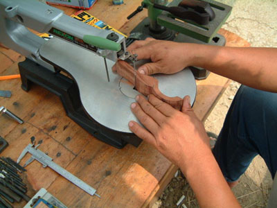 製作過程一、首先,拿來的板材得先確定它的各切面都是正的垂直的!這什麼話?每一面都會是將來製作過程的基準面,也就是你會依據這些面來做基準再做鑽孔、對齊、測量等工作,如果基準面不正,鑽出來的孔就歪了,這接下來的施工就會變得越來越困難,這點真的很重要!抓好基準面後,開始以鉛筆在板材上畫出您的理想萬力雛型,僅需先畫出兩個主要的零件:基台跟弓這兩項就可以了,其他的小塊零件都可以用裁切後的剩餘料來做。畫好雛型後第一個難關就是裁切了,您老可別想說用普通的鋸子拿來動手就要鋸!紅木這類的硬木,以手持鋸子來施工一定會鋸到你唉爸叫母!它太硬了!即使真的這樣去鋸也無法延著你的萬力雛型鋸出好的曲線,除非您想做一棵四四方方的萬力。萬力因為型體太小又是曲線,也無法以一般的鋸台來裁切!那怎麼辦?有兩種辦法,第一是使用桌上型的線鋸機,俗稱丟丟擋的東西,它可以鋸出很漂亮的曲線,不過還是因為木頭太硬,所以常常鋸完一棵萬力就要鋸斷好幾片鋸刀!另外,適用的丟丟擋一台特力屋賣價最少要七八千以上,呵!買不下去!?第二個辦法就是鑽排孔了,用電鑽延著曲線一孔一孔的鑽,把整個雛型以排孔的方式把它切出來!對於硬木,這個辦法是最有效且簡單的辦法,不過您也別試著用普通的手持電鑽來搞了!因為手持的電鑽也還是會鑽到你唉爸叫母,同時也因手持無法保持垂直,不僅施工困難,鑽出來也歪斜不好加工!最好的工具就是買一台桌上型鑽台,特力屋賣一台不用2000,要玩?只好買了! 有一點要注意的,鑽排孔會因為木頭太硬,有時候會鑽到冒煙,請小心一點,別鑽到整間房子燒起來!另外,粗胚的形狀是隨您自己高興發揮的,這點就比較難用文字來形容,您可以參考日本一些日鯽商品的網站,看看那些萬力的造型是您比較喜歡的!有一點在這裡可以再說明一下,就是弓前面那根支撐插入竿掛的小圓柱,可以分成一體成型或是分開以插入弓的方式製作,插入式的在受力這個觀點來說其實是比較夠力的,不過因為木頭夠硬,即使是一體成型的弓,在那一個受力點上,絕對是足夠承受竿掛的力量的。圓柱要磨多粗就得看您的竿掛了,這部份得在後段的製作中慢慢去磨修,去合您的竿掛。